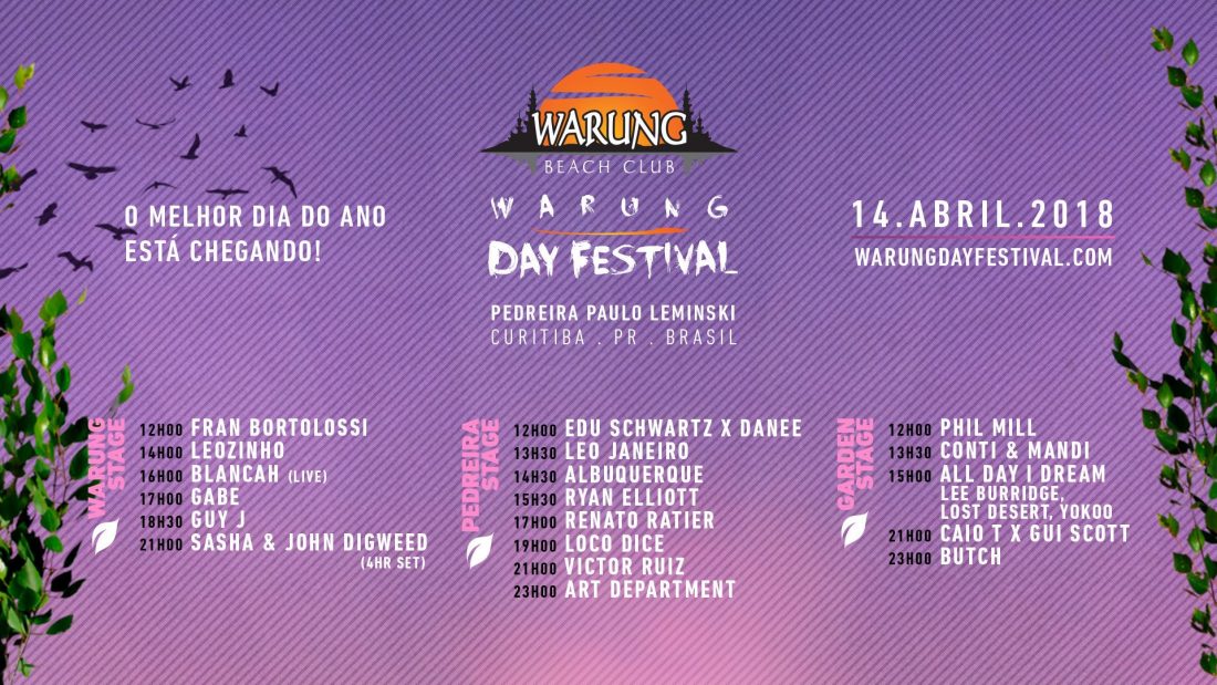 El 14 de abril se celebra la 5ª edición del «Warung Day Festival» Curitiba-Brazil, espectáculo ya consagrado y una de las fiestas más esperadas en el calendario de eventos y conciertos de Brasil. Este es uno de los principales proyectos internacionales de música electrónica y sus ramificaciones sonoras en América del Sur. En cuanto a las noticias, el festival anuncia el aguardado line-up, que estará en cada uno de los tres grandiosos escenarios con más de 12 horas de música, donde 25 artistas van a presentarse en los escenarios Warung Stage, Pedrera Stage y Garden Stage.