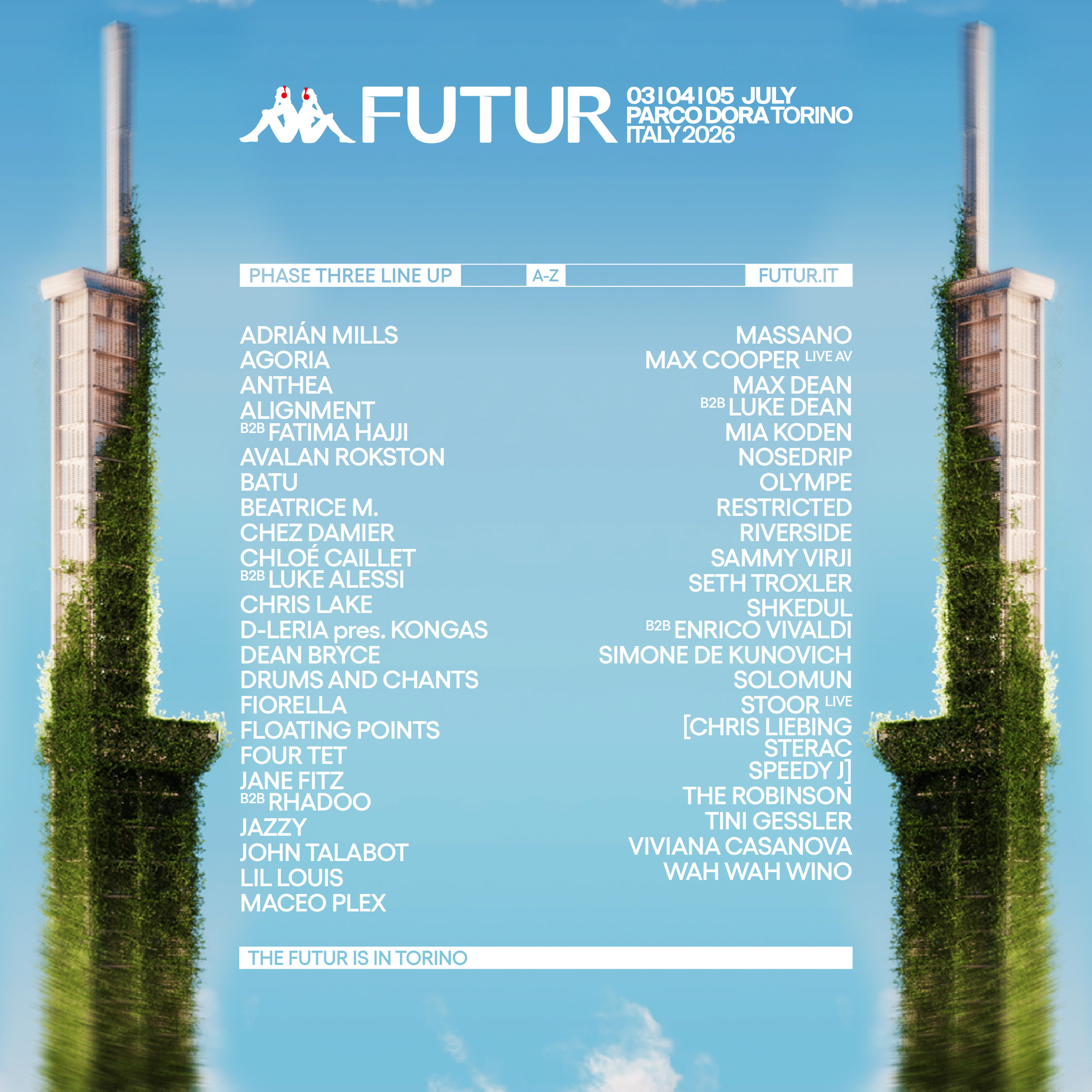 Completan este último avance artistas que debutarán en Parco Dora como la dj británica Anthea, la formación AVALAN ROKSTON, Batu dj y productor de Bristol creador del sello Timedance, la francesa Beatrice M, el dj y productor londinense Dean Bryce o Chez Damier, aka del productor estadounidense Anthony Pearsons, Otros nombres que también serán protagonistas serán Chris Lake, creador de hits como ‘Changes’, el sonido trancero de D-Leria con su show especial Kongas, el sonido underground de Drums and Chants, junto a artistas como Fiorella, Jazzy, Lil Louis, Massano, Mia Koden, Nosedrip, Olympe, Restricted, Riverside, Sammy Virji, Simone de Kunovich, The Robinson o Wah Wah Wino, conformando el line up más completo de Kappa FuturFestival en sus últimas entregas.