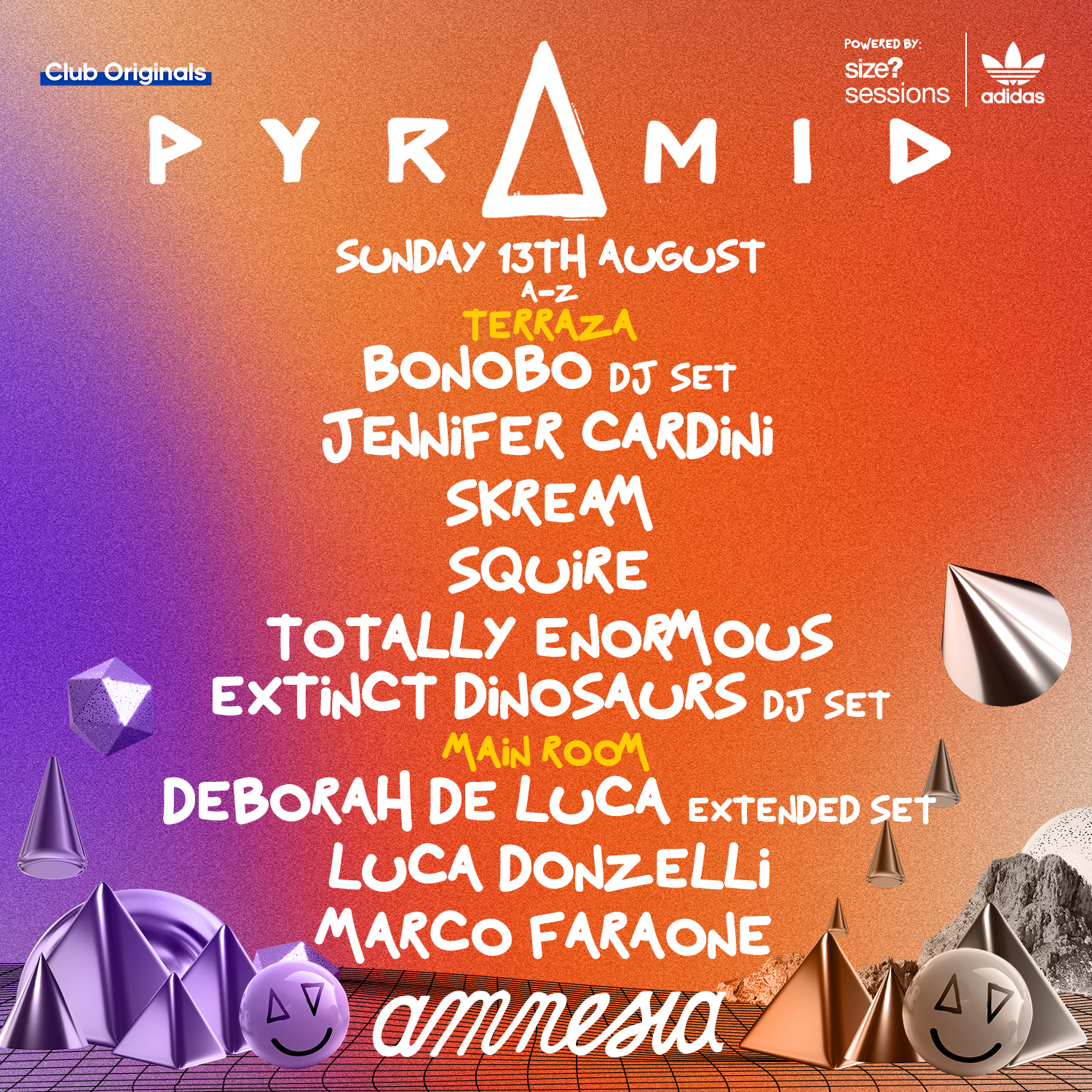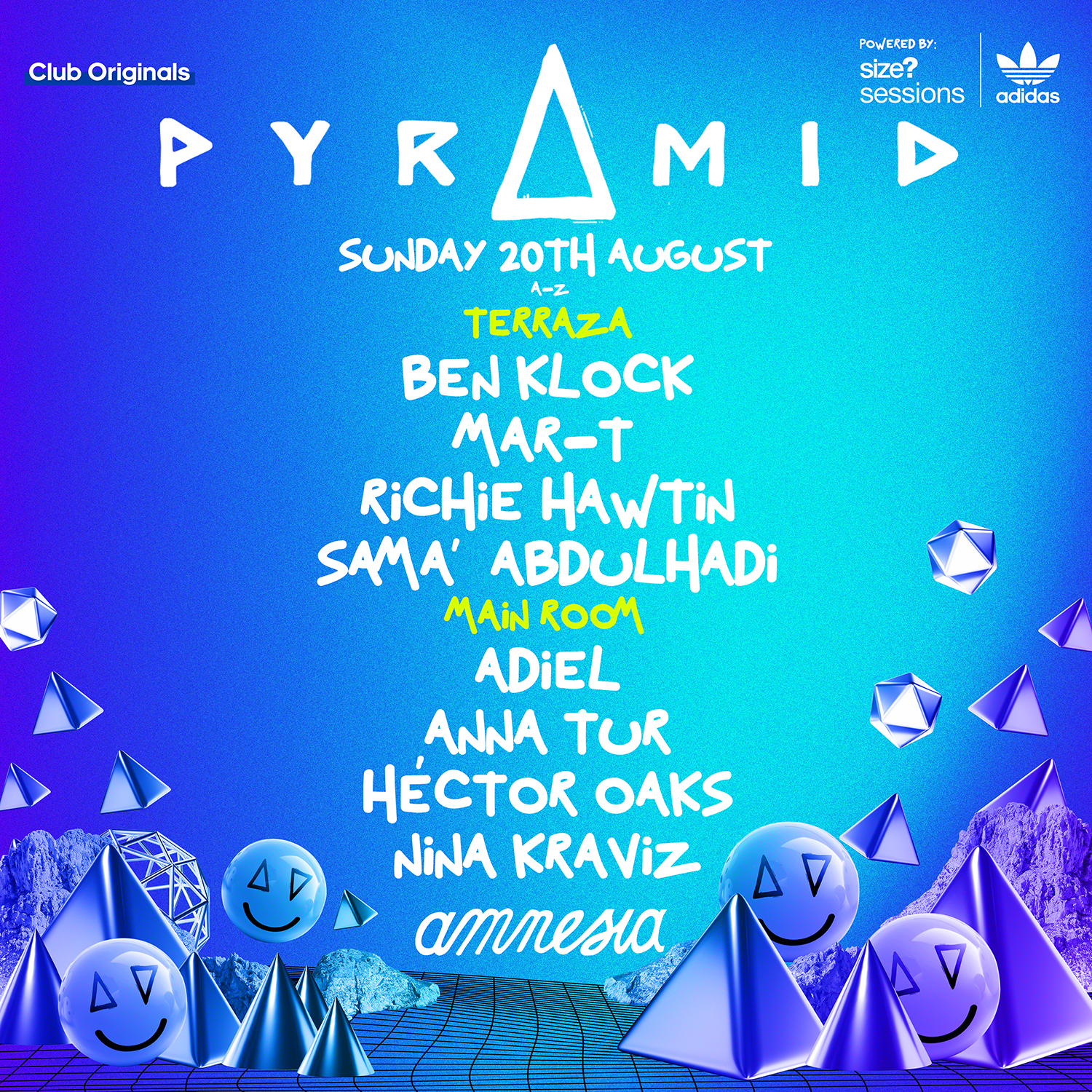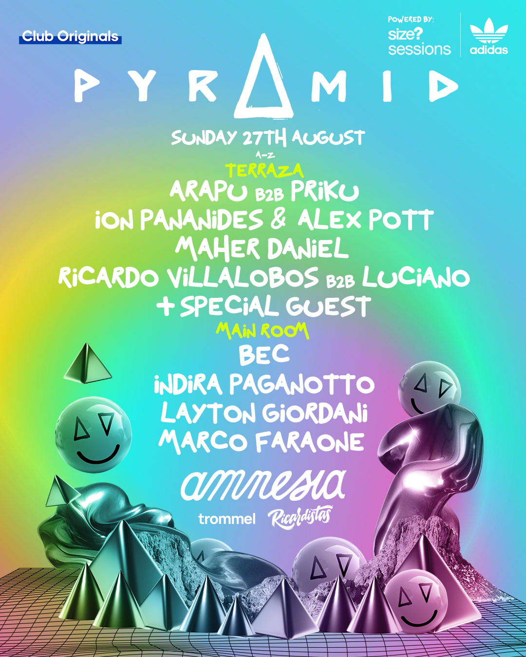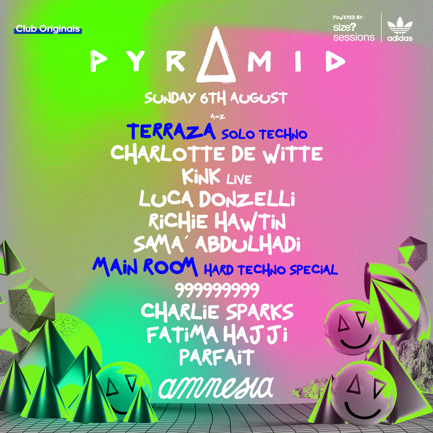 La Terraza de Amnesia va a ser un hervidero con el concepto «Solo Techno», con una constelación de estrellas que nos dejarán con la boca abierta. Luca Donzelli es un mago a lo hora de encender al clubber desde el primer minuto, un selector preciso y riguroso que no defrauda en ninguna de sus actuaciones. Techno puro, sin artificios, sin retoques, es lo que ofrece la gran Sama´Abdulhadi. Pionera palestina de la música electrónica que lleva el techno en la sangre y que lo proyecta de una forma extremadamente contagiosa. KiNK volverá a demostrar por qué es un maestro en la realización de lives, en los que dirige un ejército de sintetizadores y controladores analógicos en tiempo real. Sus actuaciones son a la vez juguetonas y experimentales, y cambian sin esfuerzo entre el house, el techno y el acid, inspiradas en el espíritu de improvisación del jazz y en la energía de la primera escena rave. Charlotte de Witte regresa a una fiesta que ayudó a que leyenda creciera, por eso estamos seguros que su set estará lleno de esa energía tan especial que transmite desde la cabina. Y por último el regreso del mesías, el regreso de la leyenda…, después de muchos años sin pisar Ibiza Richie Hawtin vuelve al club que cambió su forma de entender la cultura clubbing, el club que le tatuó una sonrisa infinita en su boca. Por eso y por mucho más esta actuación de Richie Hawtin es una de esas que no te puedes perder.., aunque no será la única que este genio realizará en Pyramid.