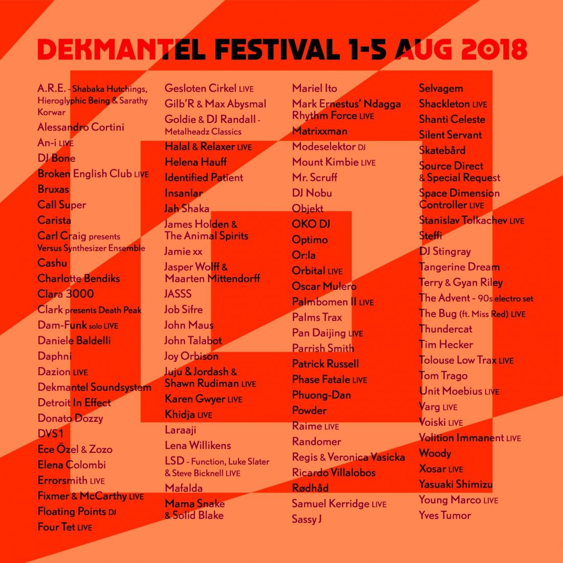 El line up de artistas invitados por el festival holandés es tan variado como extenso. Con nombres de la antigua “escuela” como Carl Craig, The Advent o el live de The Orbital. Nombres de rabiosa actualidad como los de: Terry & Gyan Riley, Tim Hecker, Helena Hauff o Lena Willikens. Conocidos y habituales del festival como Ricardo Villalobos o James Holden y novedades como las de: Joy Orbison, Floating Points, Daphni, Yves Tumor, James Holden & The Animal Spirits, Regis & Veronica Vasicka, Phase Fatale, DJ Bone, Powder.