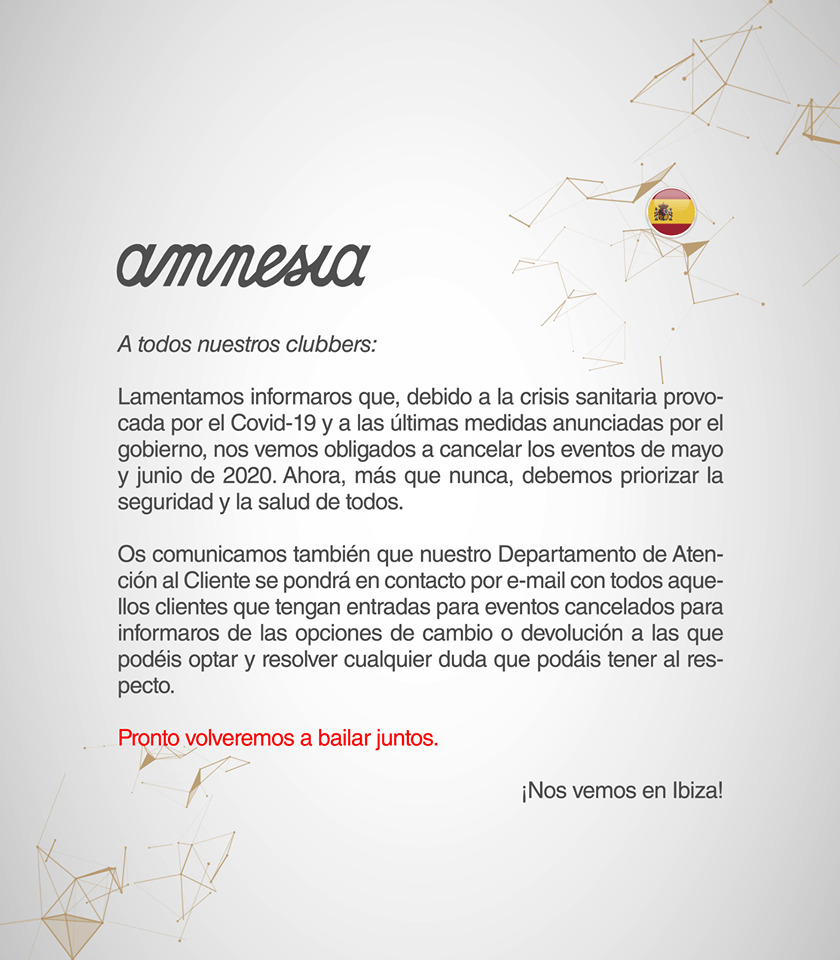 Amnesia anuncio en el día de ayer la cancelación de todas las fiestas del mes de mayo y junio.
