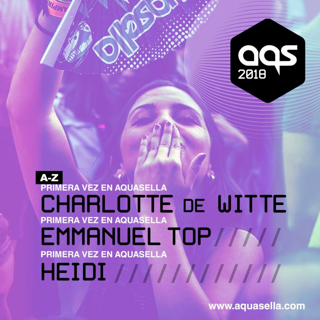 Los tres primeros nombres confirmados para este 2018 son los de la joven dj belga, Charlotte de Witte, que esta consiguiendo revolucionar las pistas de baile en media Europa. Otra mujer Dj confirmada es Heidi, que con más años de experiencia que Charlotte, llevará hasta Aquasella sonidos más deep. Para terminar este primer turno de confirmaciones, uno de los hombres con más años de carrera y uno de los mejores productores de música electrónica en su historia. Hablamos de Emmanuel Top.