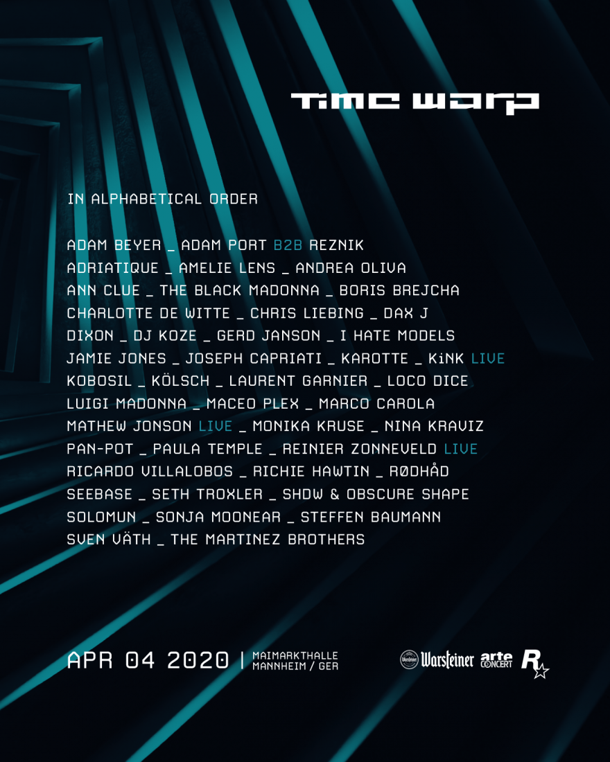 El el 4 de abril volverán a abrir las puertas de los pabellones de Maimarkt en la ciudad alemana de Mannheim y como es habitual no faltaran algunos de los míticos “peces gordos” de la industria como Richie Hawtin, Marco Carola, Sven Vath o Ricardo Villalobos. Lo que sí es noticia, son las nuevas caras que estarán en Time Warp, en este 2020 destacan la de Kobosil, Reinier Zonneveld o Andrea Oliva.