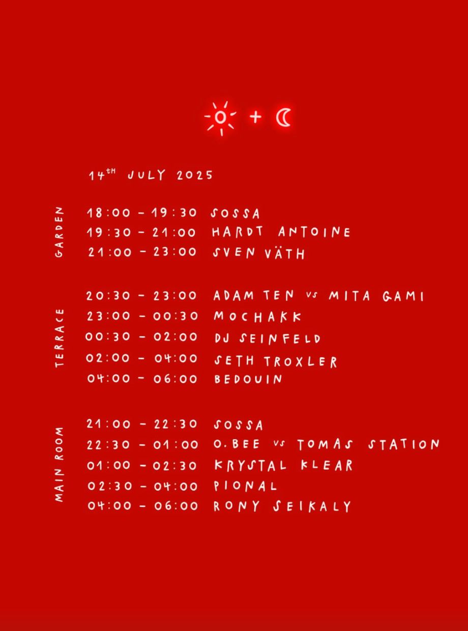 En el Terrace, a partir de las 20:30, se viene un B2B potente: Adam Ten y Mita Gami. Luego el brasileño Mochakk a partir de las 23:00h, que está en un gran momento, y tras él, DJ Seinfeld, con ese sonido entre lo-fi y emocional que siempre sorprende. La noche sigue con Seth Troxler de 02:00 a 04:00h, que nunca decepciona, y cierra Bedouin, en el horario donde el cuerpo empieza a irse pero la cabeza sigue bailando.