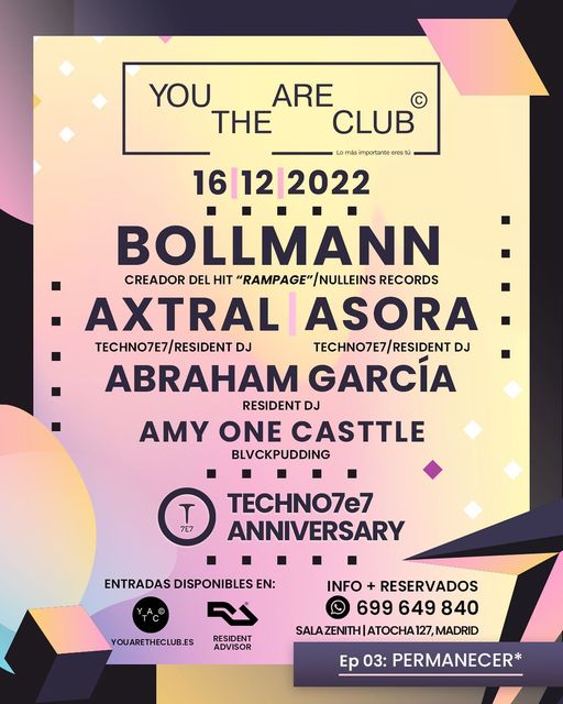 Sin descuidar la mayor cualidad que ha definido a “YOU ARE THE CLUB”, el trato cercano y personalizado a los clubbers que asistan a sus eventos, para celebrar el primer aniversario de Techno 7e7 tendremos regalos, acciones especiales, sorteos y sobre todo lo más importante, una programación musical de primer nivel con Bollmann a la cabeza.
