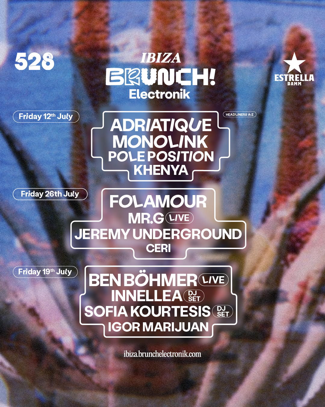 Su segunda fecha no es para menos. El viernes 19 de julio contarán con la visita del alemán Ben Böhmer, figura clave en el house melódico actual, cuyo sonido alberga toques indies y ritmos profundos que ya han cautivado los oídos de numerosos Brunchers. A su llegada, se suma también la aparición de Inellea, artista que recoge las raíces del techno para elaborar una fusión abstracta que ha surtido un gran éxito en los últimos años, y Sofía Kourtesis, una productora y DJ procedente de Perú, que incluye sus propias vocales en sus tracks para producir un sonido house cuanto menos armónico. En esta ocasión, el encargado de representar al talento nacional será Igor Marijuan, DJ habitual en numerosos eventos de la isla y muy querido por el público ibicenco.