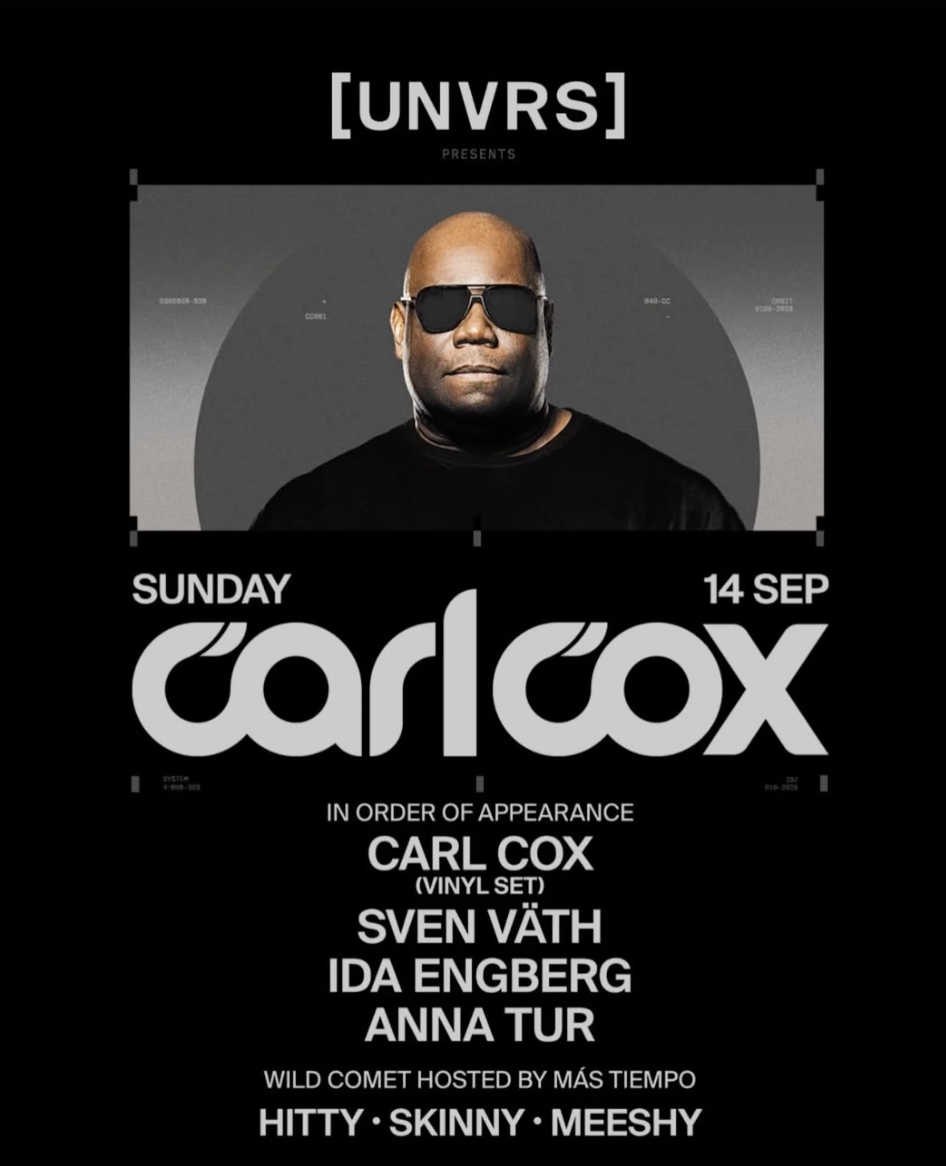 La velada contará con un line-up de lujo: además de Carl Cox, se subirán a la cabina Sven Väth, pionero y referente indiscutible de la escena electrónica; la DJ sueca Ida Engberg, reconocida por su potente y elegante selección musical; y la ibicenca Anna Tur, figura clave en la isla.