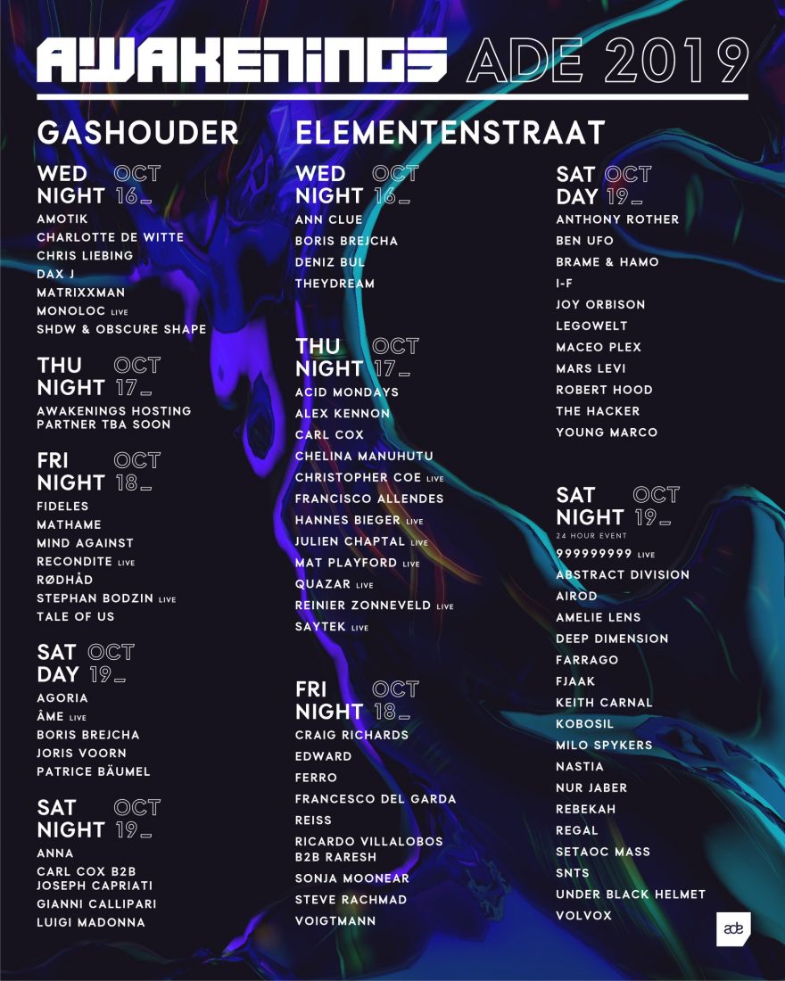 El miércoles 16, en la primera jornada, Charlotte de Witte, Chris Liebing y Dax J serán los protagonistas. Boris Brejcha, Carl Cox, Joseph Capriati o Maceo Plex, serán otros de los invitados de las fiestas Awakenings en Ade 2019.