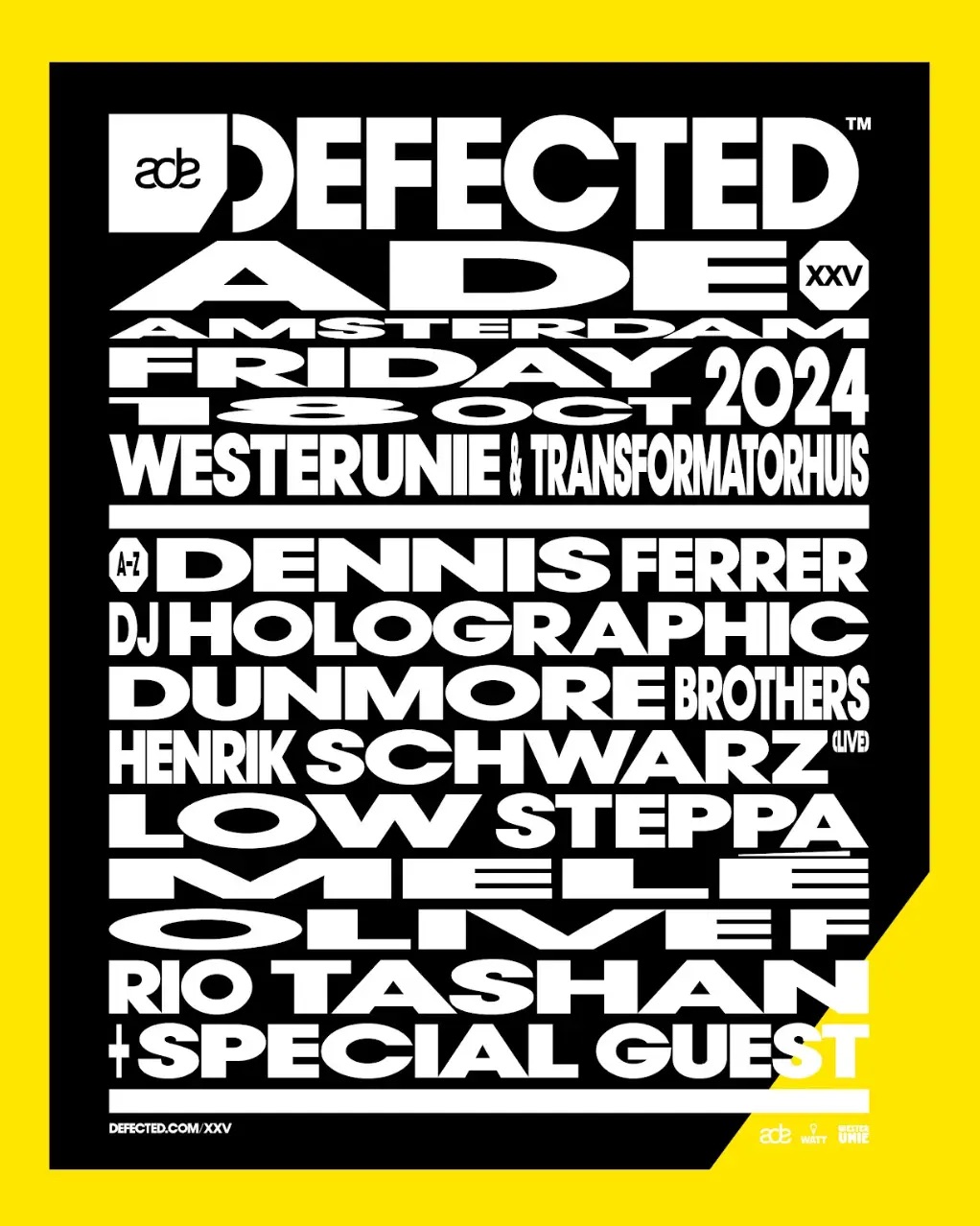 Este año, Defected celebra su 25º aniversario en el Amsterdam Dance Event (ADE) el viernes 18 de octubre de 2024 en Westerunie y Transformatorhuis. El cartel incluye a algunos de los artistas más destacados de la escena house, como Dennis Ferrer, DJ Holographic, Dunmore Brothers, Henrik Schwarz en vivo, Low Steppa, Melé, y muchos más. Promete ser una noche inolvidable, marcada por los mejores ritmos de la música house y la energía inconfundible de Defected.