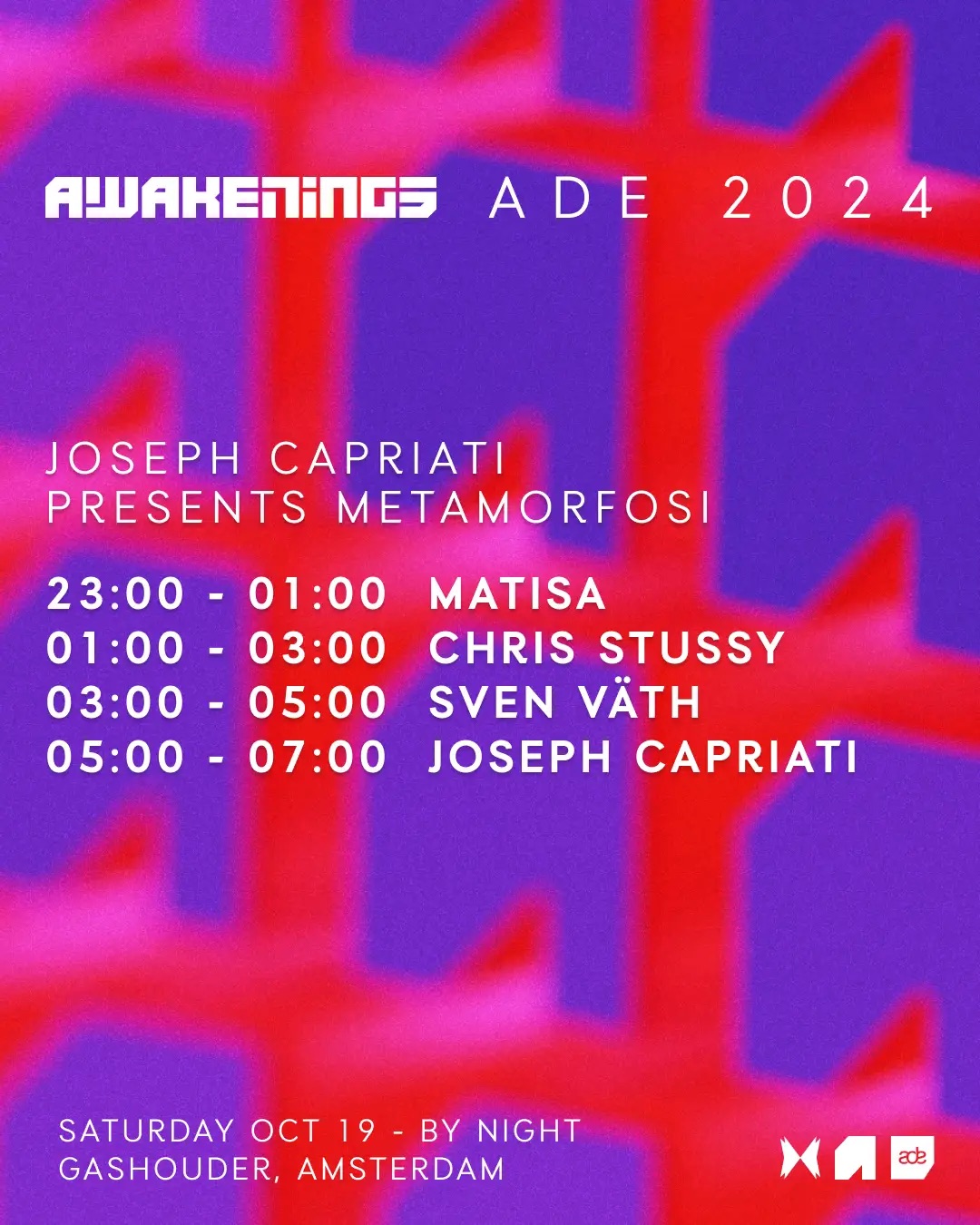 Awakenings regresa a ADE 2024 con su maratón anual de eventos, incluyendo una noche inolvidable el sábado 19 de octubre en el Gashouder, Ámsterdam. Joseph Capriati presentará su proyecto «Metamorfosi», compartiendo cabina con Matisa, Chris Stussy y Sven Väth. El evento comenzará a las 23:00 con Matisa, seguido de Chris Stussy a la 01:00, Sven Väth de 03:00 a 05:00, y cerrando la noche Joseph Capriati de 05:00 a 07:00.