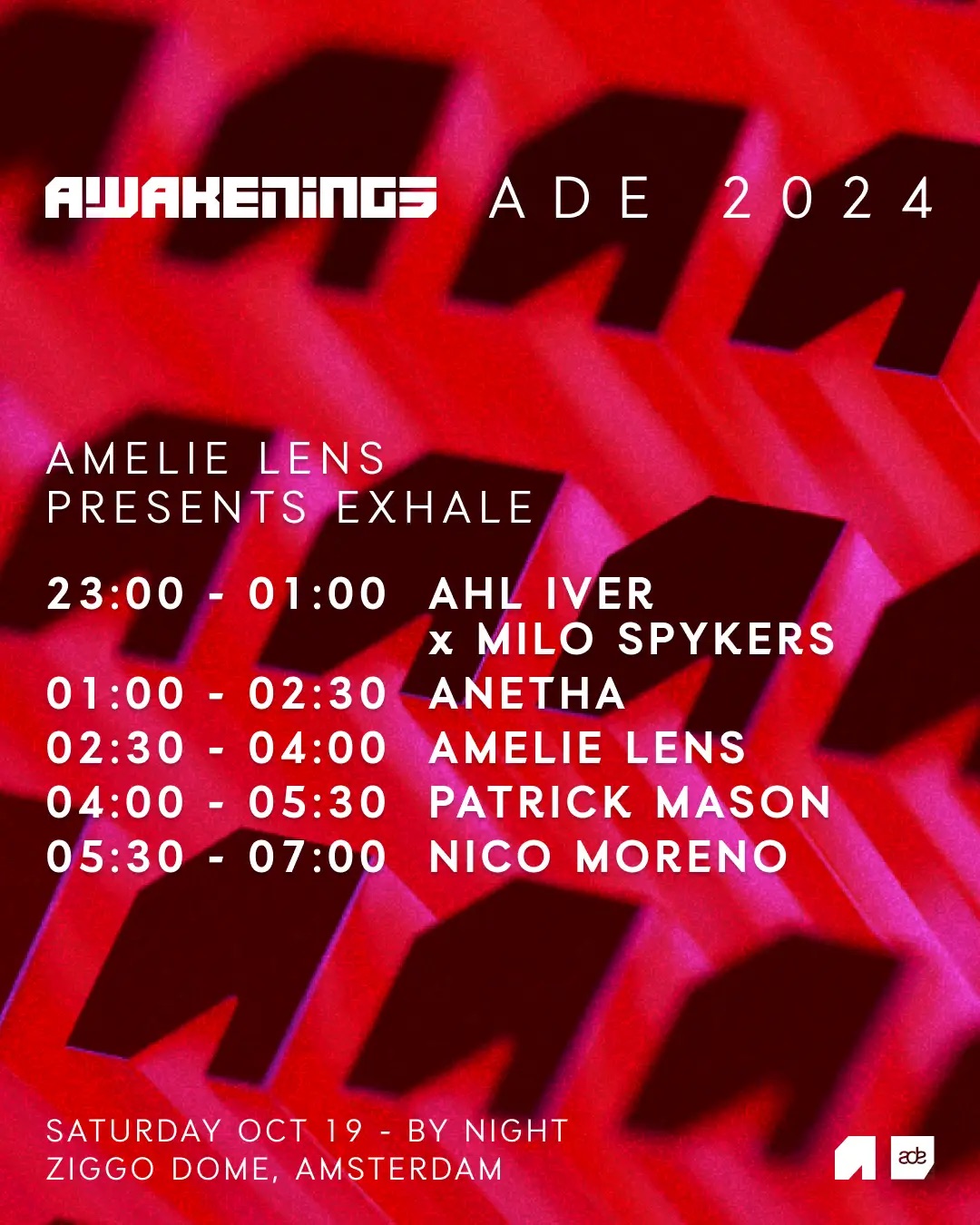 Awakenings regresa a ADE 2024 con una maratón de eventos, incluyendo Amelie Lens Presents Exhale el sábado 19 de octubre en el Ziggo Dome. El evento nocturno comenzará a las 23:00 con Ahl Iver x Milo Spykers, seguido de Anetha, Amelie Lens, Patrick Mason, y cerrando con Nico Moreno de 05:30 a 07:00. Prepárate para una noche llena de energía y techno de primera categoría en uno de los escenarios más emblemáticos de Ámsterdam.