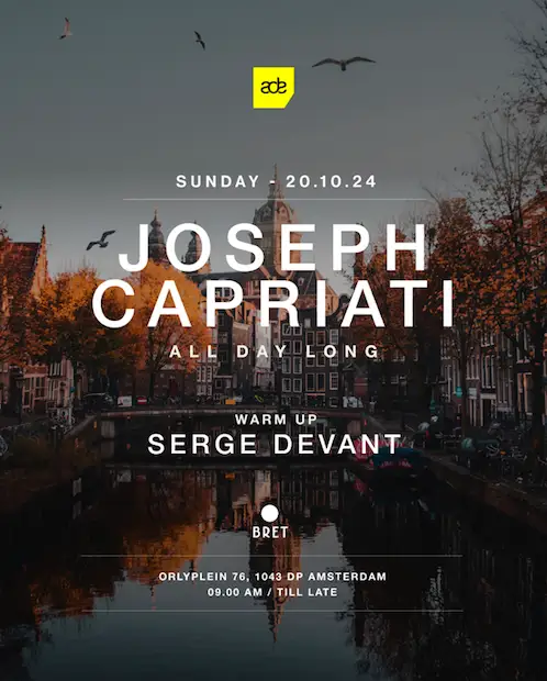 Joseph Capriati se presentará en el ADE con su set especial «All Day Long» en BRET, Ámsterdam. El evento comenzará a las 9:00 a.m. y promete ser una jornada épica, con Capriati dominando la cabina durante horas. El warm-up estará a cargo de Serge Devant, quien preparará el ambiente perfecto para una experiencia inolvidable. Esta fiesta promete una inmersión total en la música techno, en un entorno vibrante y energético.