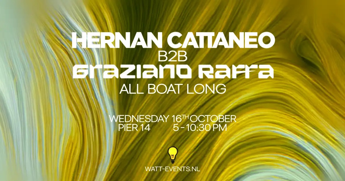 Hernan Cattaneo y Graziano Raffa ofrecerán un exclusivo set B2B a bordo de un barco. El evento, titulado «All Boat Long», se llevará a cabo en el Pier 14 de Ámsterdam, de 5:00 p.m. a 10:30 p.m. Organizado por WATT Events, este evento promete una experiencia única con una atmósfera especial y la mejor música de la mano de dos grandes del techno y progressive house.