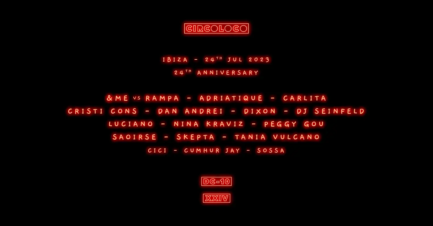 Para este aniversario Circoloco contará con una de las pocas visitas en la isla de Peggy Gou, junto a ella, encontramos otras visitas especiales como Luciano, que este 2023 se esta dejando ver en diferentes clubs y fiestas de la isla sin residencia fija, así como Dixon. Tambien volverán los habituales &me y Rampa y otras visitas importantes como las de Carlita, Dj Seinfeld, Nina Kraviz, Cumhur Jay y la residente Tania Vulcano.