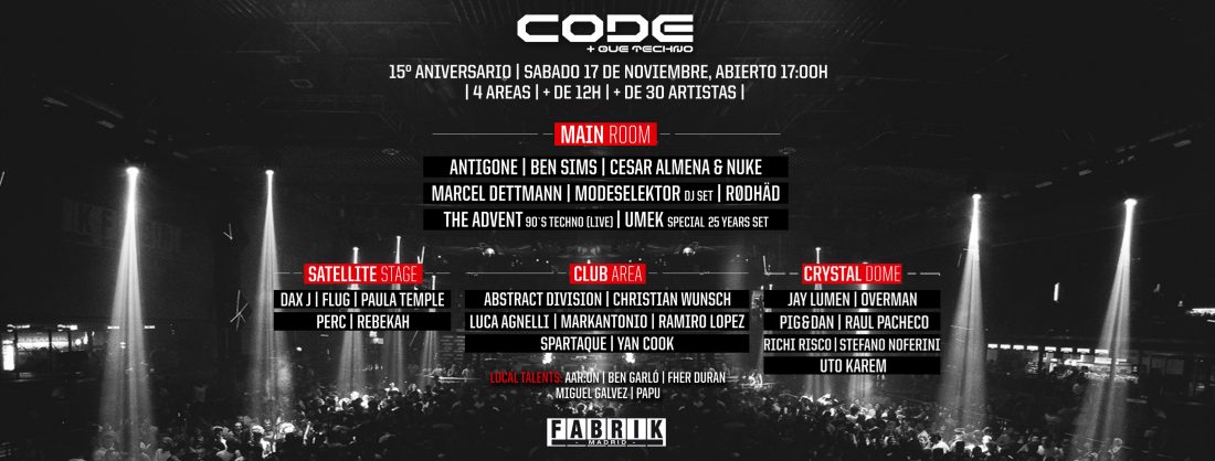Este sábado 17 de noviembre desde las 17:00, la fiesta CODE celebrará 15 años de Techno con más de 30 artistas invitados, 4 áreas de música y más de 12 horas de fiesta.