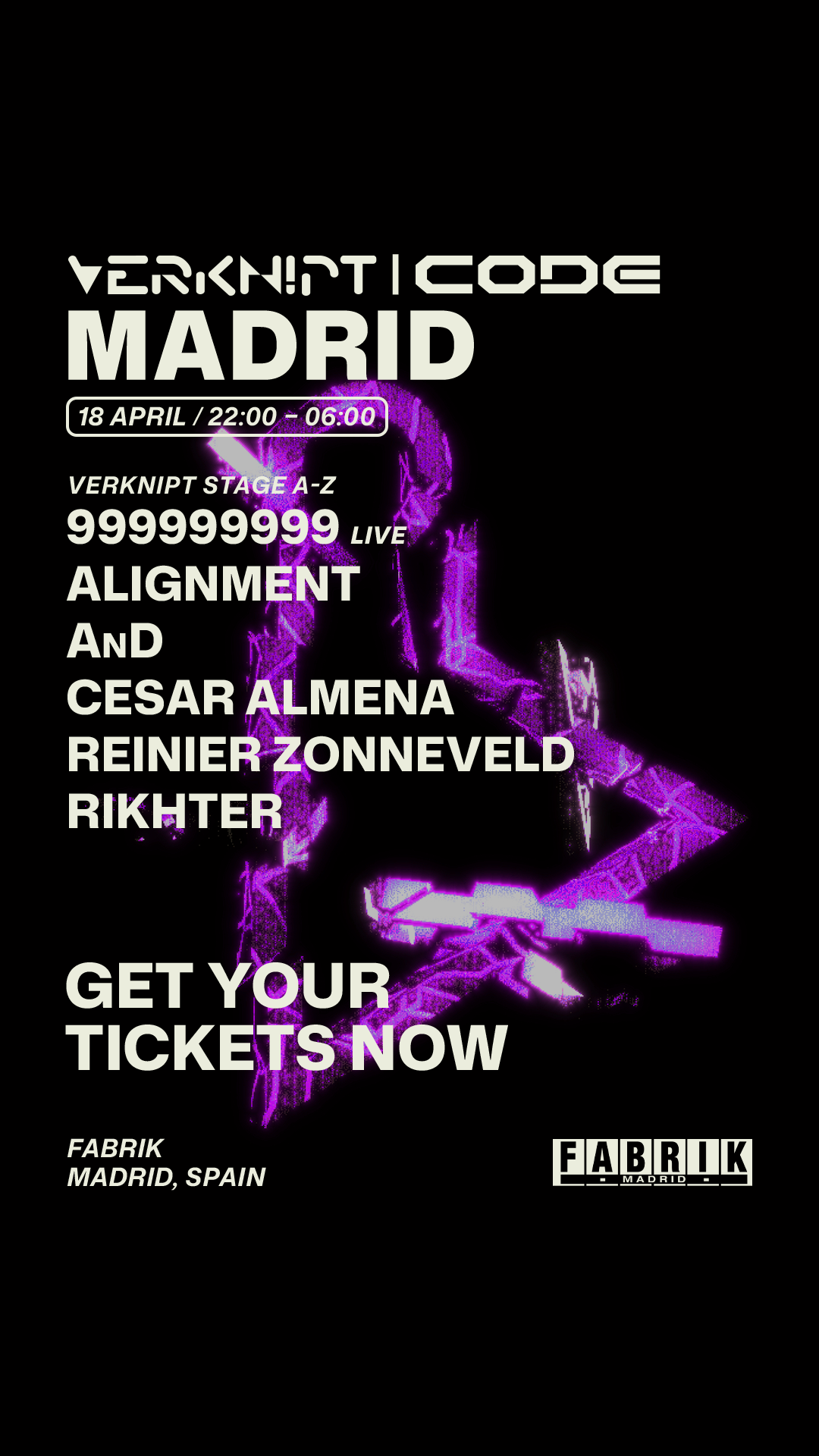 El cartel reúne dos de los directos más destacados de la escena: el dúo italiano 999999999 y el holandés Reinier Zonneveld, con propuestas marcadas por el sonido ácido y las influencias industriales. A ellos se suma la contundencia melódica de Alignment, uno de los nombres clave de KNTXT, el sello de Charlotte de Witte; el enfoque industrial de Rikhter, vinculado a Tote Sonne, agencia liderada por Kobosil y Klangkuenstler; y la energía de AnD, que transita entre el hard techno y el hardcore. La apertura correrá a cargo de César Almena, reconocido por su capacidad para leer la pista en cualquier contexto.