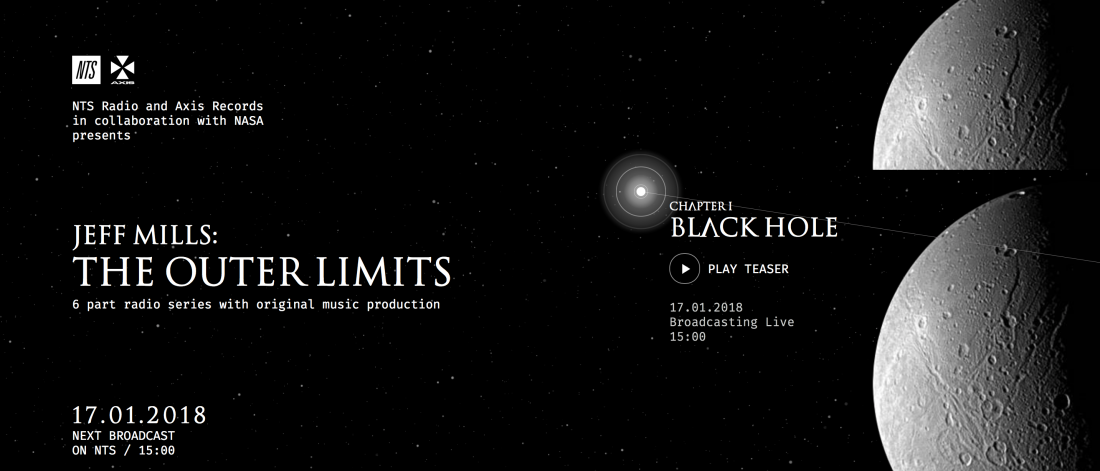 El veterano productor norteamericano, Jeff Mills, ha preparado una serie de capítulos especiales para NTS radio en colaboración con la NASA – la Administración Nacional de los Estados Unidos de la Aeronáutica y del Espacio.