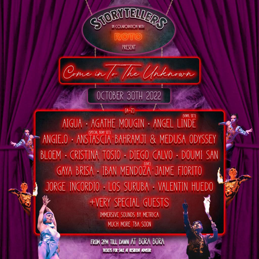 Durante la fiesta 20 de los Dj´s más importantes del panorama internacional pondrán banda sonora a esta fiesta única: Aigua, Agathe Mougin, Angel Linde, Angie.o, Anstascia Bahramji & Medusa Odyssey, Bloem, Cristina Tosio, o Valentin Huedo, entre otros muchos, y aunque la música estará muy presente en la fiesta, no será la única protagonista. “COME INTO THE UNKNOW” reúne en tres escenarios en los exteriores del antiguo Bora Bora Beach Club, espectáculos que nos dejarán con la boca abierta, proyecciones de vídeo sobre las fachadas de los edificios, espacios de food market, zonas de relax y toda la magia propia de Storytellers y ROTO.