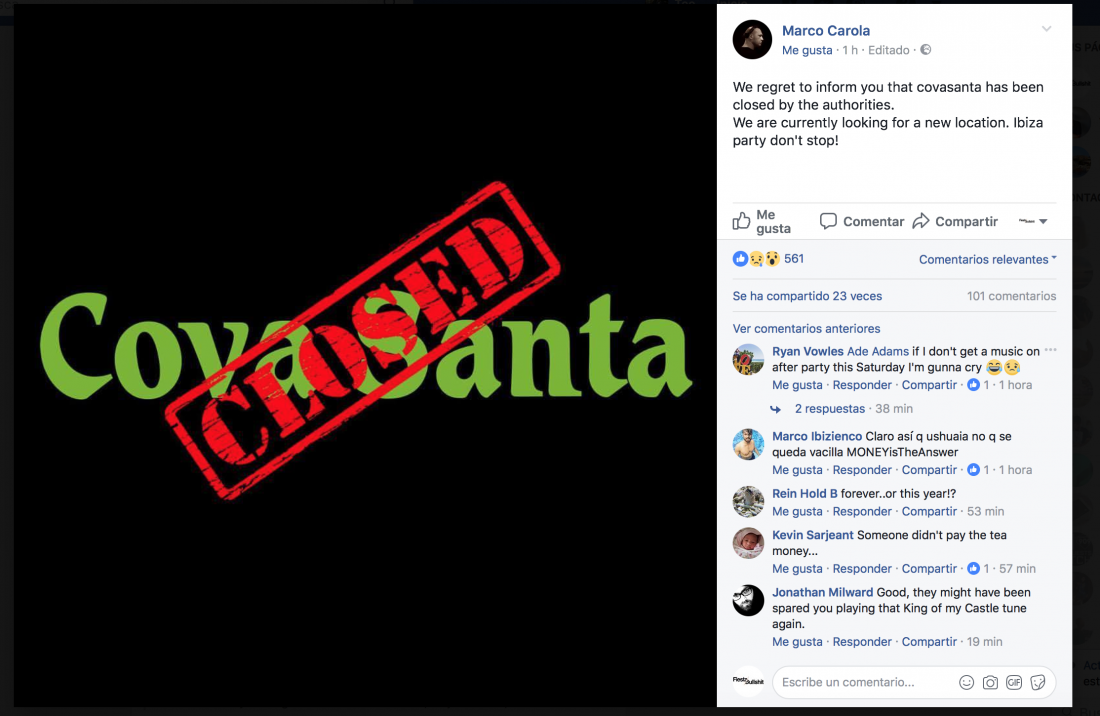El propio Marco Carola que tenía previsto celebrar 5 eventos de Music On durante el mes de septiembre en Cova Santa, ha informado del cierre del recinto en su cuenta de Facebook.