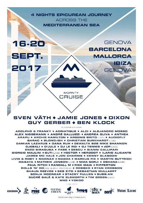 MDRNTY Cruise zarpara el próximo 16 de septiembre desde Genova y durante los días 17, 18, 19 y 20 recorrerá Barcelona, Palma de Mallorca e Ibiza. En este crucero con capacidad para 3.200 clubbers y que está dotado de 3 piscinas, de 11 bares y de 5 restaurantes, ofrece también un centro de cuidado y belleza así como pistas de tenis, bolera, club de deporte high-tech o cine 4D, todo para que no exista el aburrimiento. En lo que se refiere a música, tampoco faltara la calidad con actuaciones de artistas como: Sven Väth, Dixon, Jamie Jones, Ben Klock, Damian Lazarus, Guy Gerber, Magda, Adriatique y muchos más.
