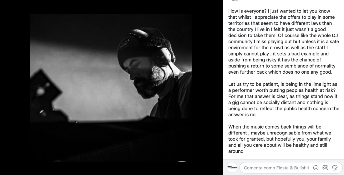El sensato comunicado del artista, ha sido compartido y aplaudido por multitud de clubbers y profesionales del sector.
