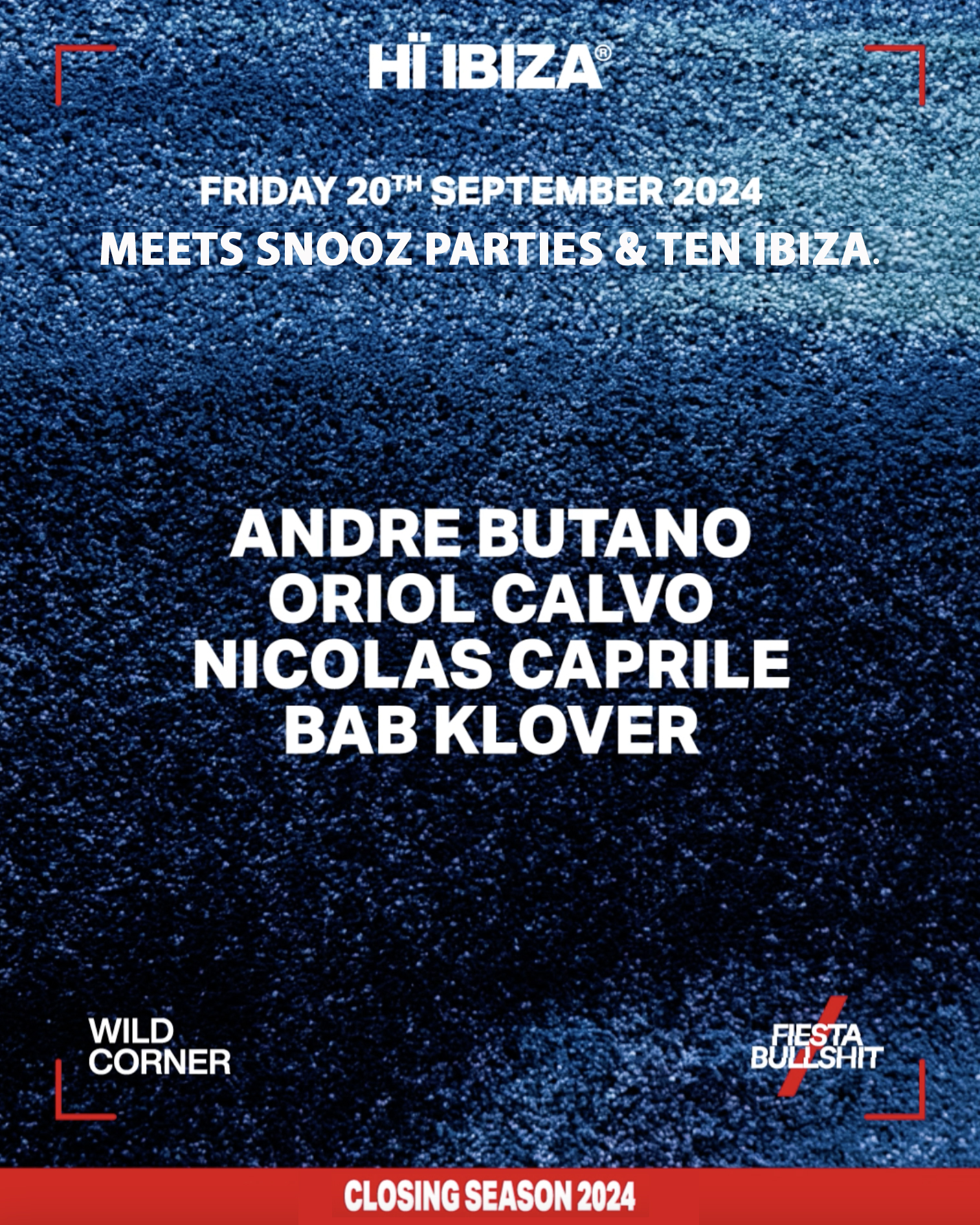 Fiesta&Bullshit y el evento del verano Support your local artist celebrará su closing party con unos invitados de lujo. Una fiesta entre Snozz + Ten Ibiza que no dejará indiferente a nadie y hará volar a todos los que se pasen por el Wild Corner con artistas como Andre Butano, repitiendo Oriol Calvo, Nicolas Caprile y Bab Klover. Desde las 23.30h estarán listos para haceros bailar.
