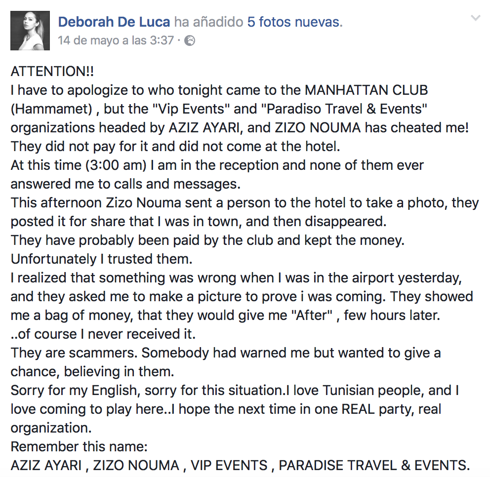 La artista napolitana que hizo caso omiso de los comentarios negativos recibidos anteriormente sobre estos promotores, le toco sufrir en primera persona como la dejaban esperando en la recepción del hotel para recibir el dinero por la actuación prevista.