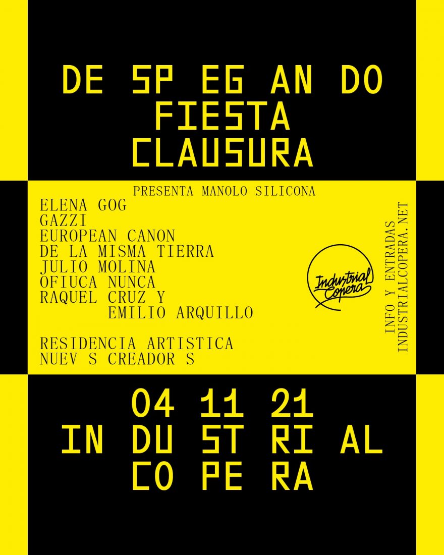 Culminando un proceso que comenzó con la selección de 7 proyectos que han venido desarrollándose entre mayo y julio de 2021, Despegando cierra ahora el ciclo de su primera edición con una fiesta de clausura donde se presentarán todas las propuestas que han formado parte de ella. Las entradas se pueden comprar en la propia página web del club al precio de 5€: https://industrialcopera.net/event/despegando-fiesta-clausura/