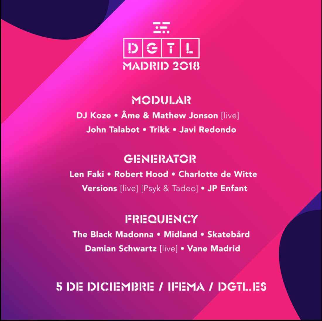El próximo 5 de diciembre, IFEMA se llenará de música, arte y revolución para disfrutar al completo de la primera edición de DGTL Madrid. El festival, fiel a su particular estética industrial, ha tomado el diseño de un sintetizador modular para nombrar los tres escenarios en los que se repartirán los casi 20 artistas que forman el line up: Modular, Generator y Frequency. Gracias a sus tres espacios, los asistentes podrán pasar del techno más duro a la propuestas de mayor índole melódico o al siempre bailable Chicago house en cuestión de minutos. No en vano, los distintos ‘stages’ del festival siempre han servido para disfrutar tanto de la electrónica más underground, como también de los sonidos más mainstream en un mismo lugar y bajo un mismo paraguas: el del inconfundible sello DGTL.