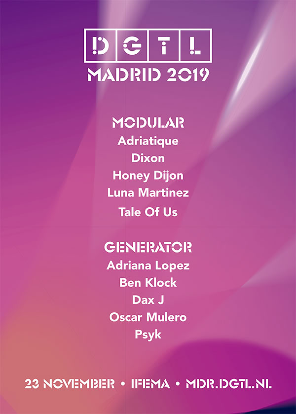 DGTL Madrid presenta un cartel con una combinación perfecta de grandes nombres con talentos emergentes y en la que también estará presente la escena madrileña. El espacio de la Feria de Madrid se dividirá en dos stages independientes, por un lado Modular, dedicado a los sonidos más melódicos y eclécticos del cartel, mientras que el sonido que dominará el Stage Generator será el techno underground.