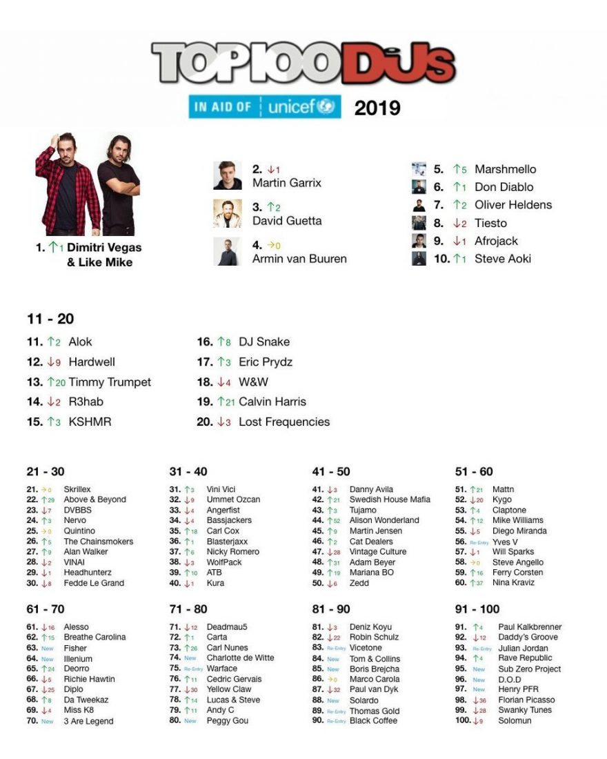En la encuesta de DJ Mag Top 100 DJs han votado la friolera cifra de 1,3 millones de personas lo que supone un aumento de 100.000 personas en la última encuesta de 2018. Una vez más, los 100 mejores DJs se asociaron con UNICEF, la principal organización mundial para la infancia. Gracias a las amables donaciones de votantes y DJs durante los últimos tres años, se han recaudado más de 112.000 euros para UNICEF. Con este dinero, UNICEF ha podido proporcionar 150.000 vacunas que salvan vidas a niños y niñas en peligro.