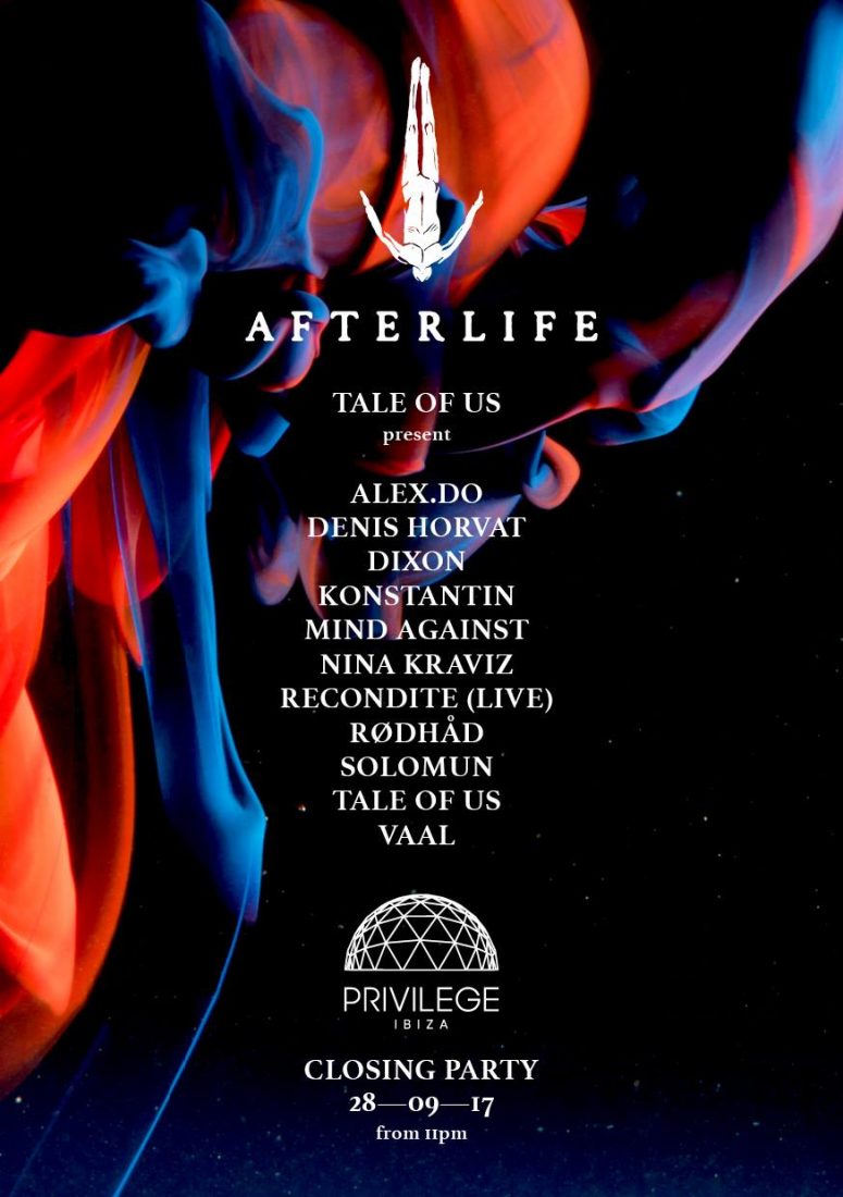 Para el closing de Afterlife, que servirá también para el closing general del club de san Rafael, se apuesta por un gran listado de artistas invitados que se distribuirán por las 3 salas de Privilege. Vista Terrace con: Solomun, Dixon, Tale Of Us, Recondite (live), Mind Against y Vaal. En el Hall (Main Room) podremos ver a: Nina Kraviz, Rødhåd, Tale Of Us y Konstantin. Por ultimo en Chamber: Alex.Do, Vaal y Denis Horvat.