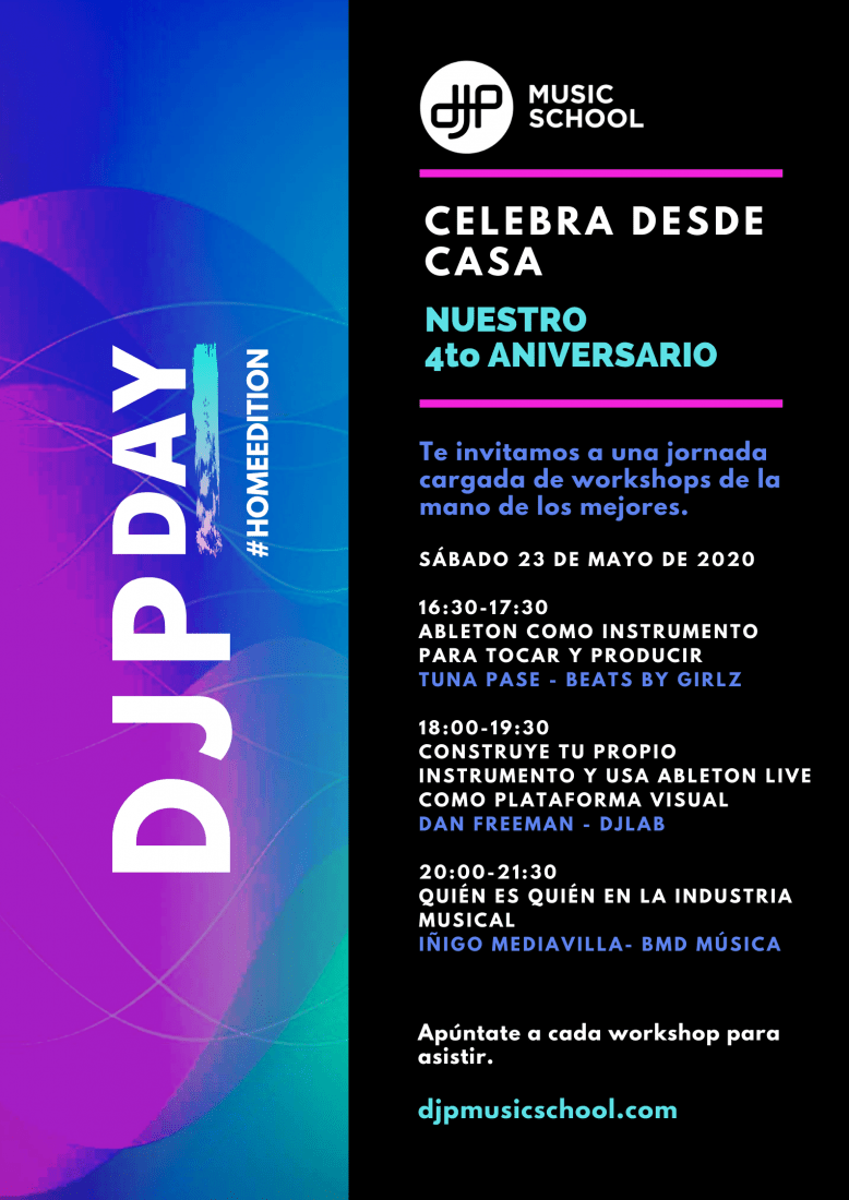 Con este evento denominado DJP DAY #homedition, DJP Music School, la escuela de Producción Musical y DJ en Madrid quiere celebrar contigo, por todo lo alto y junto a los mejores su IV aniversario. Para asistir a los diferentes workshops debes inscribirte previamente aquí. Se realizarán este sábado 23 de mayo de 2020, a partir de las 16:30h, a través de la plataforma Zoom.