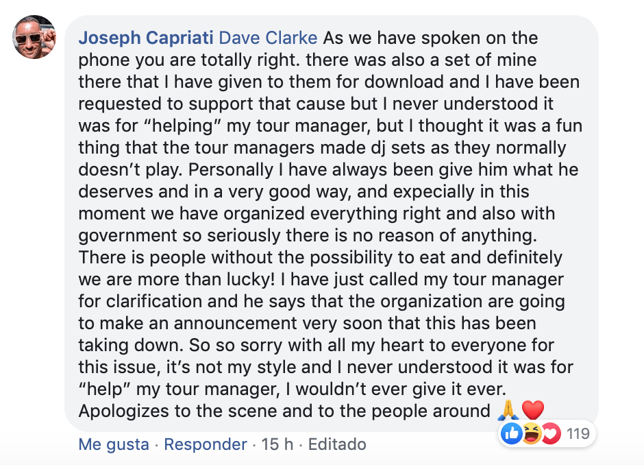 Como era de esperar para cualquier persona con dos dedos de frente y con los pies en el suelo de la realidad, la iniciativa explotó en las redes. Y no lo decimos en el buen sentido, ya que la ola de críticas y comentarios negativos inundó las redes. Fue tal el impacto que la iniciativa fue retirada junto a los vídeos de apoyo de los DJs. Incluso alguno de ellos, como el propio Capriati tuvo que salir a pedir perdón afirmando que no se había enterado muy bien de lo que estaba apoyando.