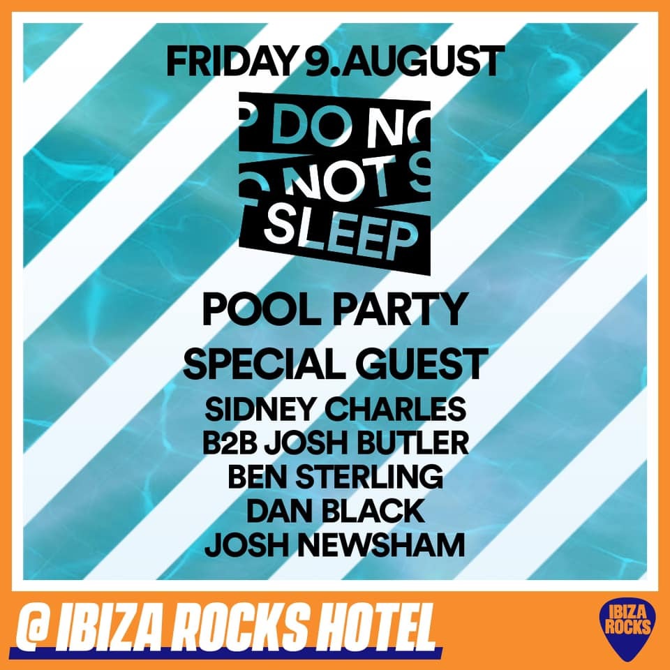 Do Not Sleep visita por primera vez las instalaciones de Ibiza Rocks para celebrar un día de piscina con sonido que vendrá de la mano de un Special Guest acompañado de un B2B de dos asiduos de Do Not Sleep, Sidney Charles va mano a mano con Josh Butler para un set que promete abarcar toda la gama del house y el techno.
