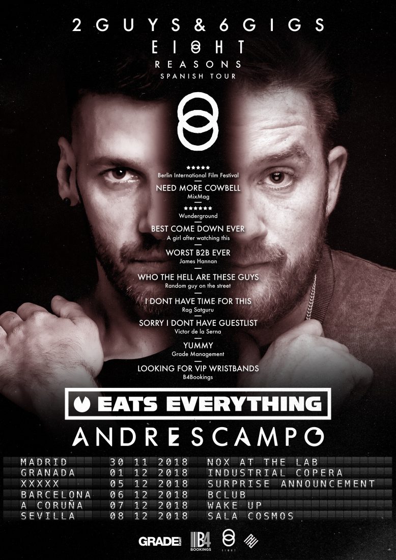 La gira «EI8HT RASONS«, que tiene 6 fechas como parte de sus presentaciones en España y coincide con el lanzamiento del nuevo sello techno del dúo, EI8HT Records. Ambos productores llevarán sus ritmos eclécticos a una variedad de ciudades españolas durante el tour, que se iniciará en Madrid el 30 de noviembre. Tocando en fechas en Granada, Barcelona y A Coruña y un anuncio sorpresa muy especial en el lugar, la gira EI8HT REASONS llegará a un explosivo final el 8 de diciembre en Sevilla.