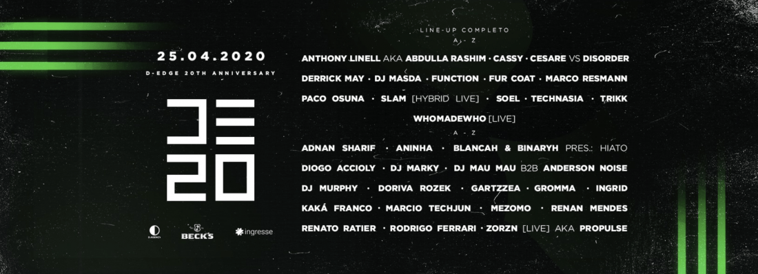 El 25 de abril, artistas de la talla de Anthony Linell, Cesare vs Disorder, Derrick May, DJ Marky, Technasia, DJ Masda, Fur Coat, Marco Resmann, Paco Osuna, Slam, WhoMadeWho o el local Anderson Noise se darán cita en D-Edge.