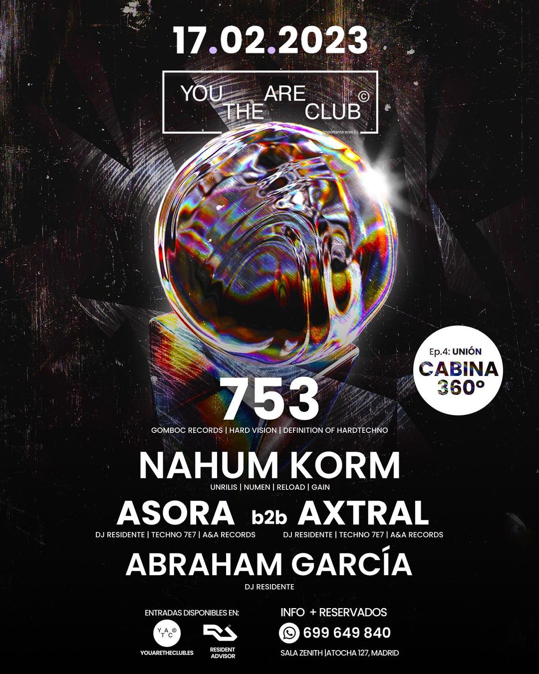 La gran sorpresa del año pasado en la escena clubbing “YOU ARE THE CLUB” arranca este año con la misma fuerza y con el doble de ilusión. Una ilusión más que justificada tras el exitazo que supuso su último evento. El próximo 17 de febrero regresa a su residencia en Zenith para regalarnos una master class de cómo organizar una fiesta y cómo diseñar una programación musical coherente.  La banda sonora estará a cargo del dúo 753, Nahum Korm y los residentes Asora b2b Axtral y Abraham García.