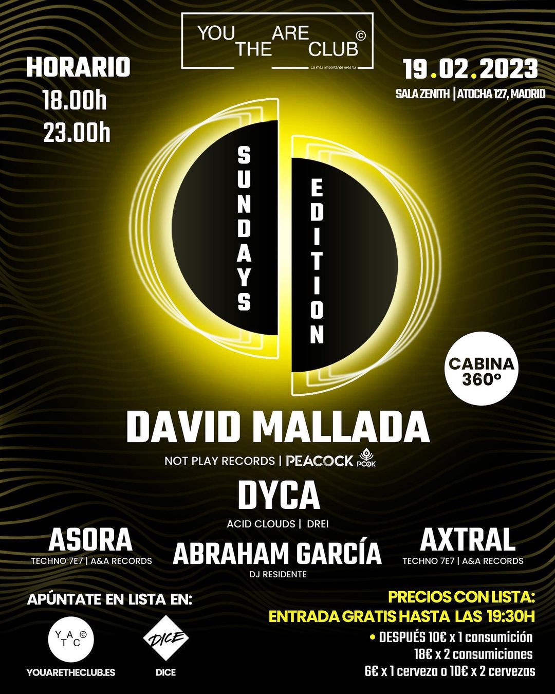Pero aquí no terminan las buenas noticias, ya que el universo “YOU ARE THE CLUB” se expande. El domingo 19 de febrero presentan Sundays Edition en la sala Zenith, una propuesta de tarde indoor que contará con las actuaciones de David Mallada, DYCA, Asora, Axtral y Abraham García.