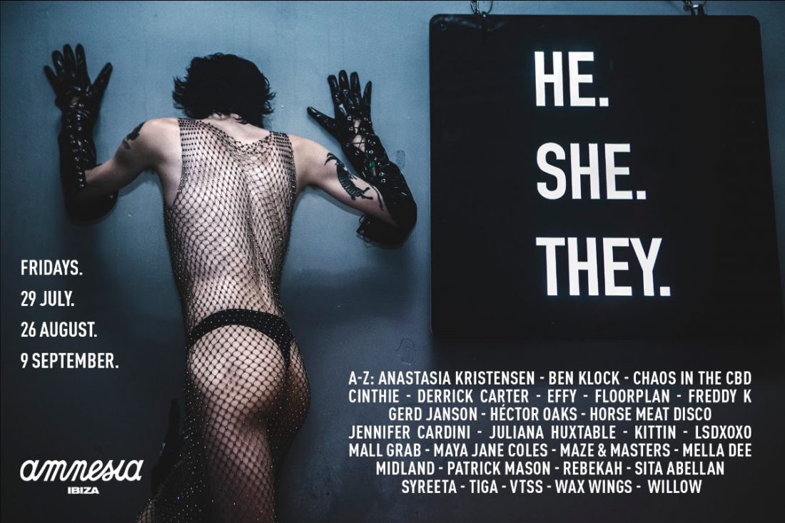 Otra de las marcas que han anunciado sus planes para Ibiza es la de HE.SHE.THEY. Que ha preparado tres únicas fechas en la isla y lo hace con algunos nombres tan interesantes como los del español: Hector Oaks, Ben Klock, Derrick Carter, Rebekah, VTSS o Willow.