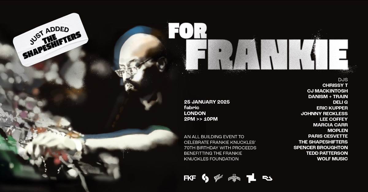 There will be two official Frankie Knuckles Foundation approved events scheduled both in the UK on the 25th January at fabric and at Metro in Chicago on the 19th January. All proceeds being donated to the Frankie Knuckles Foundation.