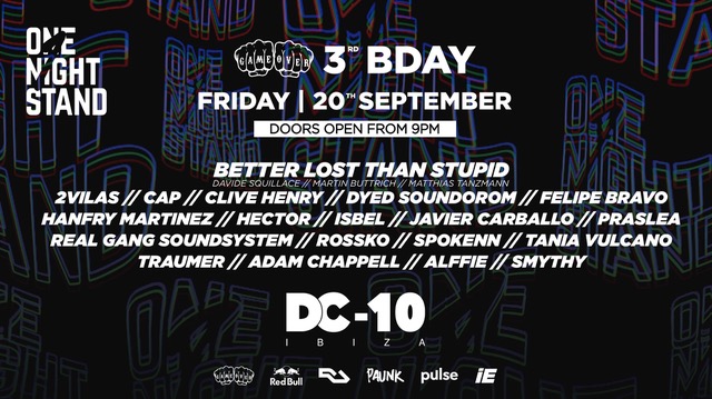 One Night Stand season is almost over, but not before one final throw down on September 20th at the iconic DC10. This party also marks the 3rd birthday for the Game Over team behind the night, so is set to be a huge one with Better Lost Than stupid aka Davide Squillace, Martin Buttrich and Matthias Tanzmann, Hector, Javier Carballo and Hanfry Martinez, Tania Vulcano b2b Clive Henry, Real Gang Soundsystem, Rossko, 2Vilas and of course the Game Over residents themselves.