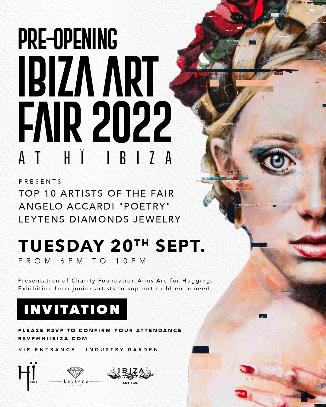 HI IBIZA is pleased to offer Angelo Accardi´s “Poetry” art statue made of 1200 kg steel a beautiful exhibition place between their palm trees in the Secret Garden. You can join also the exclusive and luxurious jewelry pieces of the Leytens Diamonds from Belgium. At the event we will also present the Charity Foundation “ARMS ARE FOR HUGGING” and will exhibit some of our junior artists who would like to support children in need.