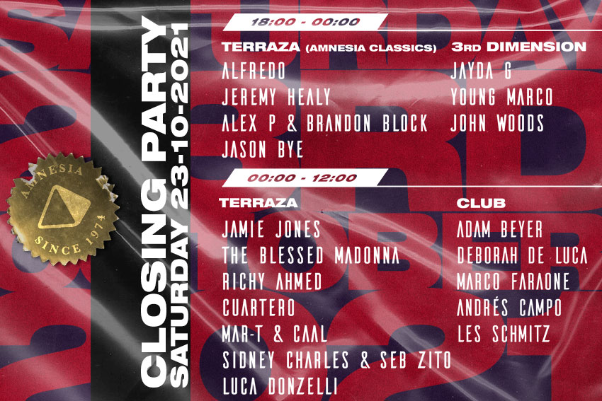 JAMIE JONES, THE BLESSED MADONNA, DJ ALFREDO, DEBORAH DE LUCA ARE SOME OF THE DJS THAT WILL PERFORM AT THE AMNESIA CLOSING 2021.