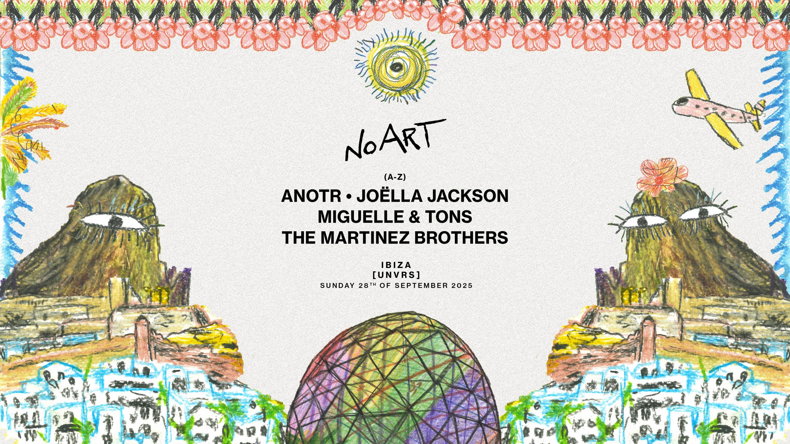 This one-off event promises a fully immersive cultural experience. No Art is known for transforming unexpected spaces into sensory playgrounds, and this Ibiza edition will be no exception. Spanish artist Diego Sainz Garcia has been commissioned to develop bespoke visual content, drawing inspiration from the island’s natural beauty and [UNVRS]’s iconic dome. His artwork, created using coloured pencils with a direct and free drawing, represents the spirit and energy of electronic music. It incorporates key elements of Ibiza and the venue, including flowers, palms, blue seas, people, planes and eyes dancing together.