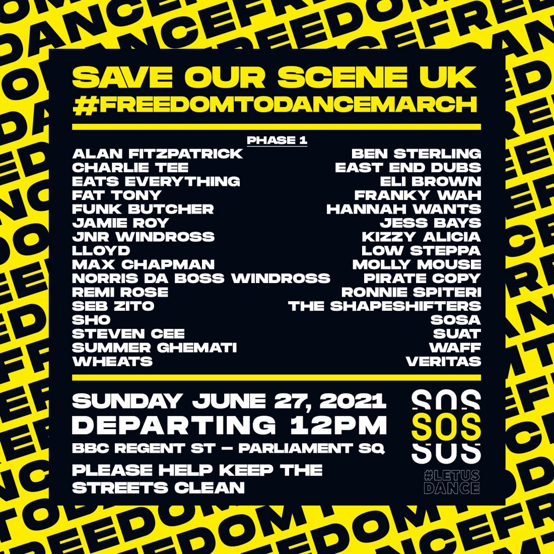On Sunday 27th June 2021, Save Our Scene UK (“SOS”), #LetUsDance and friends will be demonstrating in London with performances from some of the biggest names in music. It is expected to be the largest demonstration the music industry has ever seen.
