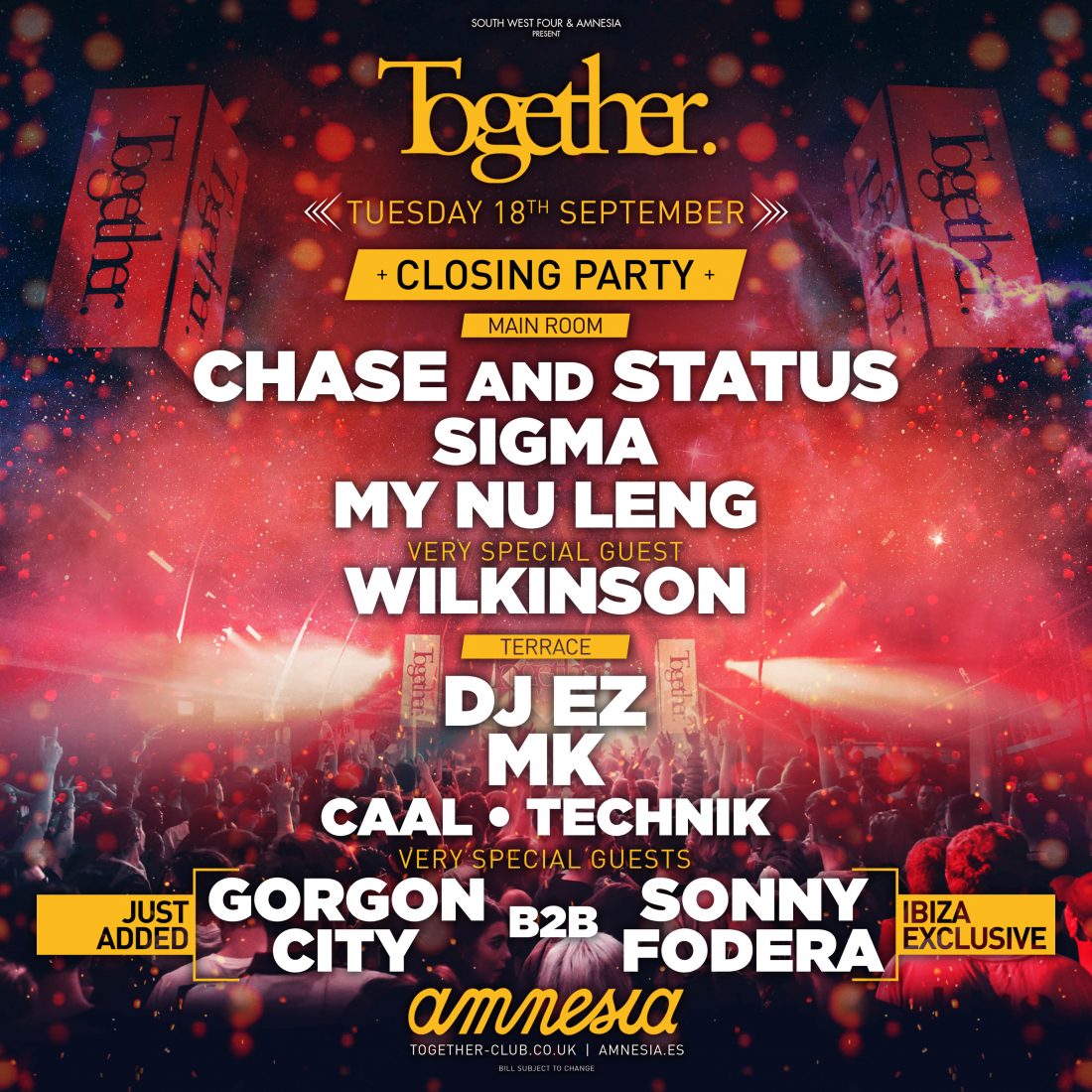 After a monumental season, Together are doing it all again one more time with a giant closing party at Amnesia on Tuesday September 18th. Season long stars Chase & Status headline once more with Sigma, My Nu Leng, Wilkinson, and DJ EZ, MK, CAAL, Technik, plus special guests Gorgon City and Sonny Fodera playing an Ibiza exclusive back to back.