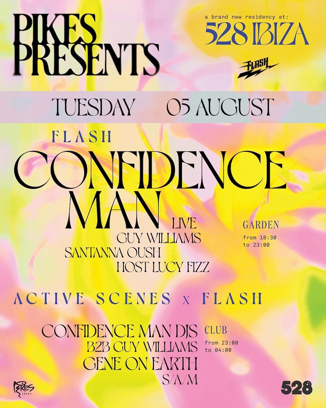 Las noches de los martes están marcadas por la serie Pikes Presents, que arranca el 5 de agosto con Flash con un show imperdible: Confidence Man en directo como gran protagonista, acompañados por Guy Williams, Santanna Oush y la energía inconfundible de Lucy Fizz como host. La fiesta comienza en el Garden (18:30–23:00) y continúa en el club hasta las 04:00 con sesiones de Confidence Man DJs, Gene on Earth, S.A.M. y un b2b especial entre Guy Williams y Confidence Man.