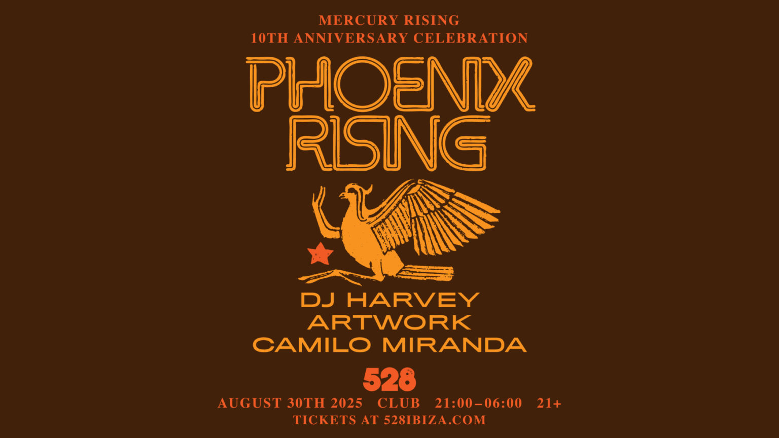 El viernes 30 de agosto, DJ Harvey celebra los 10 años de Mercury Rising con una noche muy especial: Phoenix Rising, una sesión extendida en el club de 528 Ibiza de 21:00 a 06:00. Le acompañan Artwork y Camilo Miranda en un viaje sonoro elegante, cósmico y atemporal.