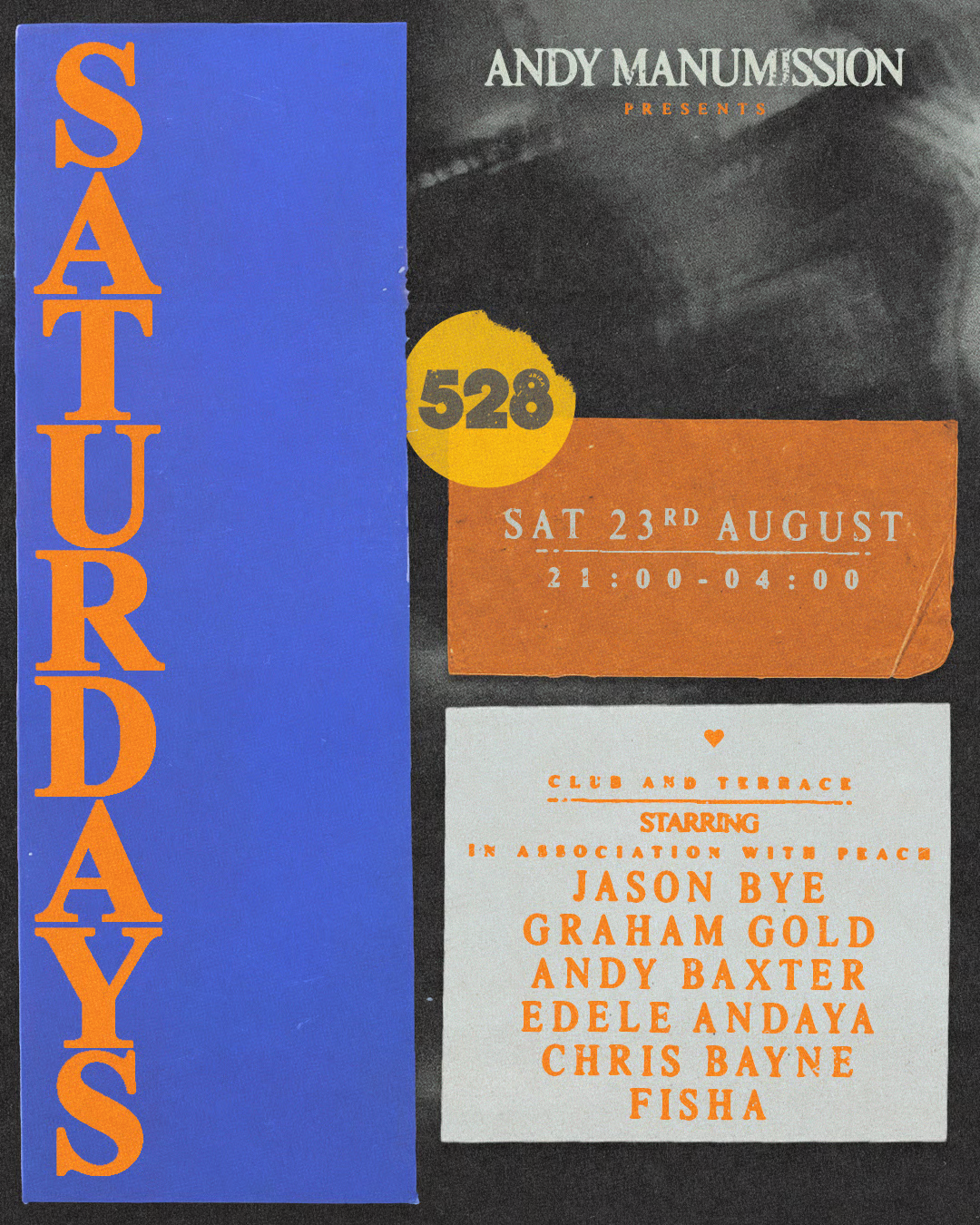 El sábado 23 de agosto, Andy Manumission cierra el mes con otra noche para el recuerdo, esta vez en colaboración con Peach. Desde las 21:00 hasta las 04:00, se alternarán en la terraza y el club los sets de Jason Bye, Graham Gold, Andy Baxter, Edele Andaya, Chris Bayne y Fisha. Un viaje musical entre el house clásico, el groove y el espíritu original de Ibiza.